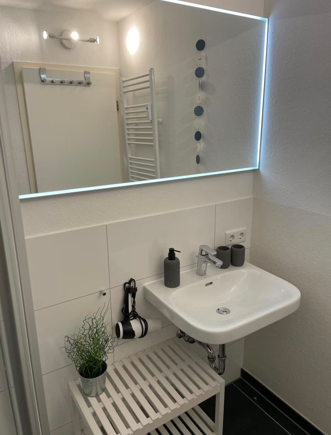 Det veludstyrede badeværelse har toilet, håndvask med spejl og hårtørrer. Sengelinned, håndklæder og badehåndklæder er allerede til rådighed som startudstyr. Til daglig brug er der også et fælles vaskerum, tørrestativ og støvsuger til rådighed.