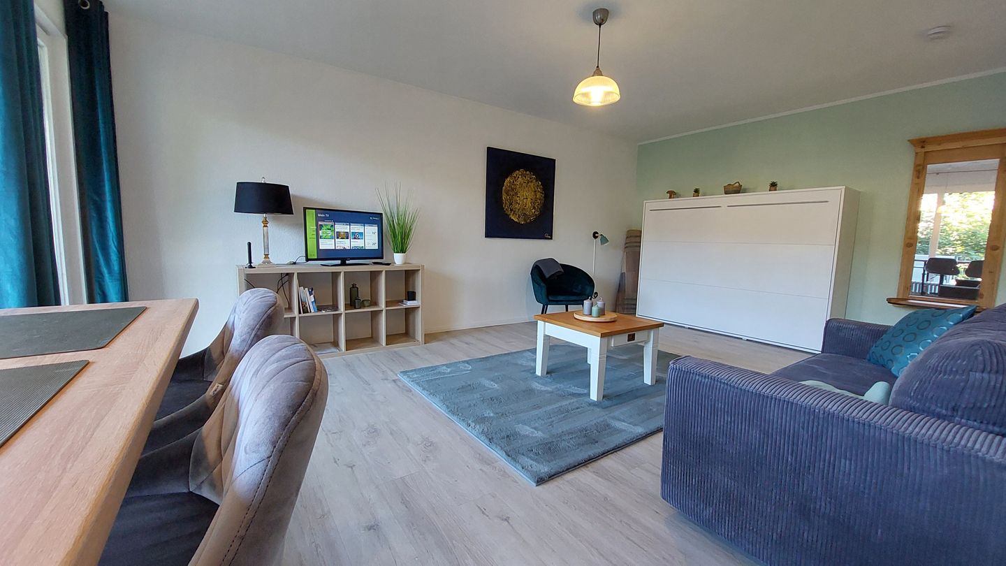 Die Unterkunft verfügt neben dem kombinierten Wohn- und Schlafbereich über ein komfortables Duschbad. Im Wohnbereich erwartet Sie eine Sofaecke mit Essbereich und Esstisch; der Bodenbelag ist als pflegeleichter Designerbelag ausgeführt. Für Unterhaltung und Komfort stehen Ihnen ein TV (35–44 Zoll) mit digitalem Kabelanschluss und internationalen Kanälen sowie WLAN mit Internetgeschwindigkeit ab 100 MBit/s zur Verfügung. Sichtschutz an allen Fenstern sorgt für Privatsphäre; Rauchmelder sind vorhanden.