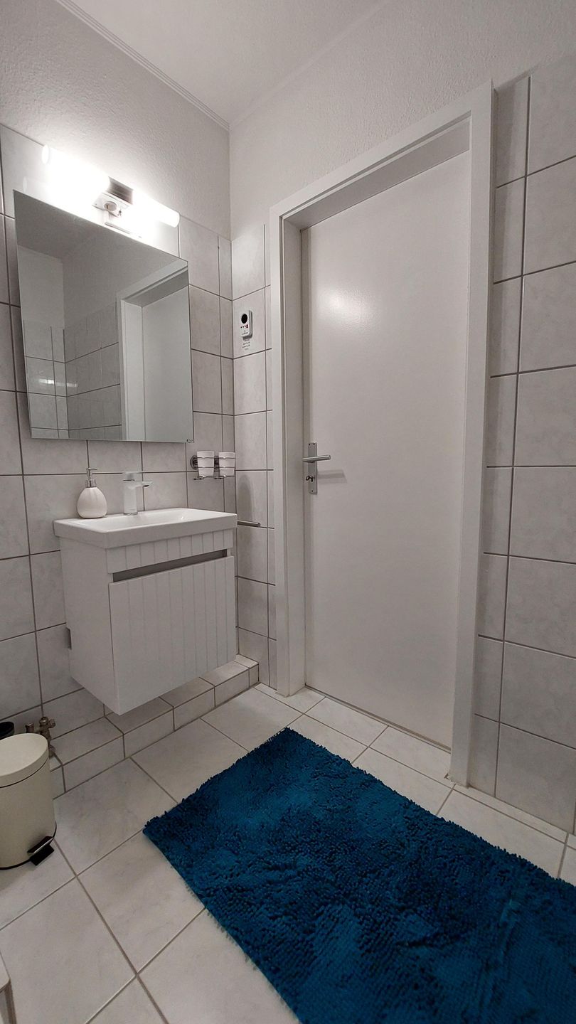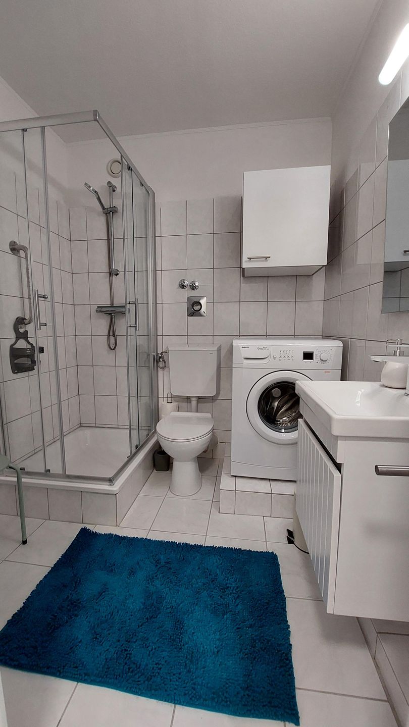 Das Duschbad ist mit WC, Waschbecken, Spiegel und einer Dusche ausgestattet. Bettwäsche sowie Handtücher und Badetücher sind inklusive, ebenso eine Erstausstattung. Für längere Aufenthalte stehen Waschmaschine zur Eigennutzung, Wäscheständer, Bügeleisen und Bügelbrett bereit; Staubsauger ist ebenfalls vorhanden.